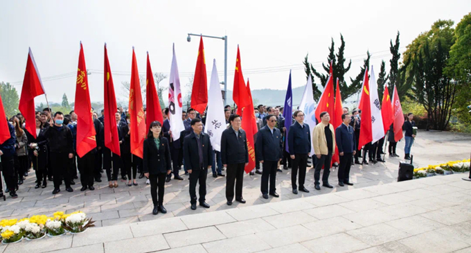 為緬懷革命先烈,傳承紅色基因,進(jìn)一步推動(dòng)黨史學(xué)習(xí)教育深入人心,4月13日上午,蘇豪控股集團(tuán)黨委在江寧橫山烈士紀(jì)念碑開展憑吊活動(dòng)。集團(tuán)黨委班子成員、二級公司班子成員、支部書記、黨務(wù)工作者、黨員代表、團(tuán)員代表、工會(huì)代表及總部黨員代表共179人參加。上午9時(shí),活動(dòng)正式開始,全體黨員整齊列隊(duì)革命烈士紀(jì)念碑前。兩名黨員代表將集團(tuán)黨委敬獻(xiàn)的花籃擺放至紀(jì)念碑前,集團(tuán)黨委書記、董事長王正喜代表全體黨員鄭重整理挽聯(lián)。全體黨員向?yàn)槊褡褰夥哦⒂芦I(xiàn)身的革命烈士三鞠躬,沉痛默哀。在莊嚴(yán)肅穆的紀(jì)念碑前,集團(tuán)黨委副書記姚蓓帶領(lǐng)在場黨
